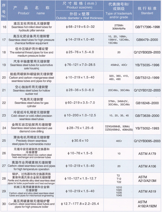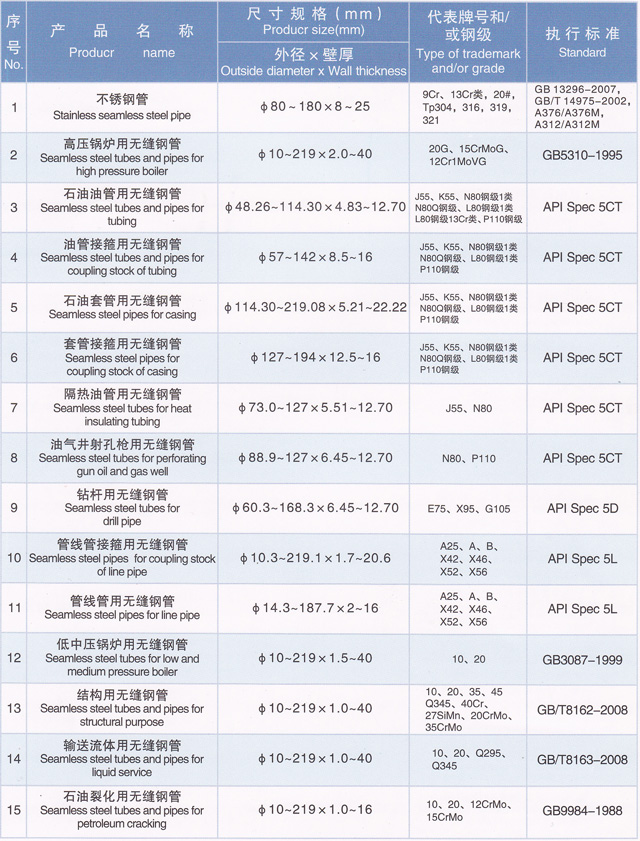 企業(yè)堅持追求技術創(chuàng)新和結構調整高水平的發(fā)展理念,近年來,為滿足國內外市場需求,投資6億元,引進了德國、美國及國內先進技術裝備和管理模式,進行了大規(guī)模的技術創(chuàng)新和產品結構調整,已形成熱軋和冷拔管二大系列、30多個品種、1000多個規(guī)格、年產40萬噸以上無縫鋼管生產能力,以及以被命名為天津市名牌產品的石油油管、石油套管、管線管、鉆桿管為主導產品,以低中壓鍋爐管、高壓鍋爐管、不銹鋼管、液壓支柱管、汽車半軸套管、船舶用管、流體輸送管、結構管、石油裂化管、建筑用管等為基礎產品的結構調整大格局,產品規(guī)格覆蓋Φ10~244.5×1.0~45mm,廣泛應用于油田、石化、機械、礦山、電力、汽車、船舶及鍋爐制造等行業(yè)。